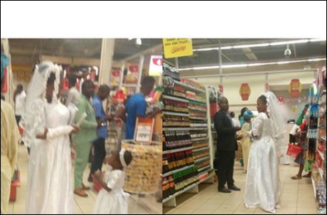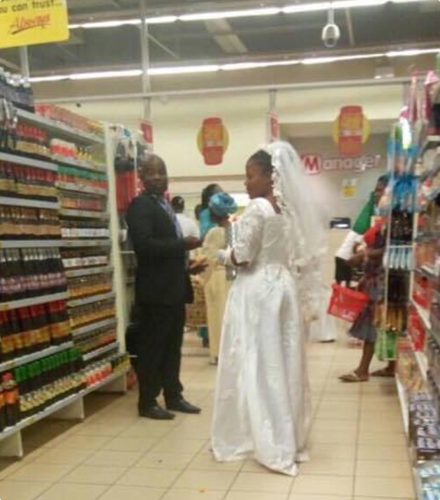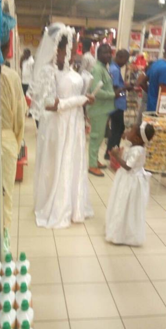An unidentified bride, was caught on camera still wearing her wedding gown and allegedly shopping for bread at a Shoprite mall in Akure, the Ondo state capital on Friday.